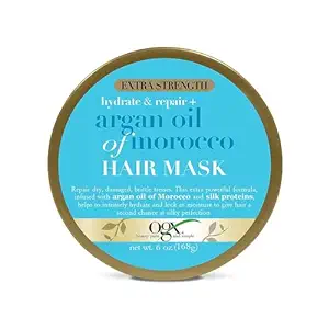 The 6-ounce container of OGX Extra Strength Hydrate and Repair plus Argan Oil of Morocco Hair Mask Treatment gives damaged and dry hair a renewed look and feel of silky perfection and radiant shine.