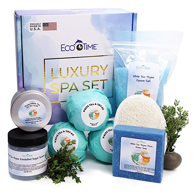 This 8 Piece Thyme White Tea Bath and Body Set contain 3 Large Fizzies Bath Bombs, Epsom Salt, Butter Soap, Body Sugar Scrub, Soy Wax Candle, and Loofah. This safe and all-natural product set feels amazing on your skin and rejuvenates your body and soul. Crafted with the closest attention, these products promote Smoother, Softer & Brighter Skin as they are enriched with Shea butter, Thyme White Tea, Vitamin E, and a wide variety of other ingredients which nourishes the skin deeply.