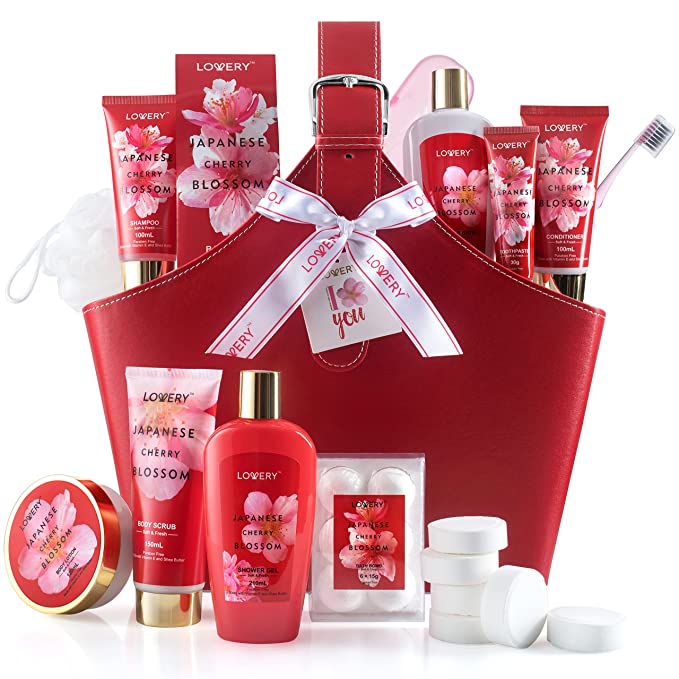 This Japanese Cherry Blossom Bath Set contains Shower Gel, Bubble Bath, Shampoo, Conditioner, Bath Crystals, Body Lotion, Shower Steamer Tablets, Bath Bombs, Bath Salt
