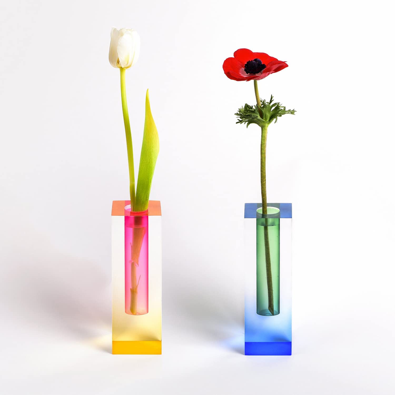Some rooms are incomplete without a minimal statement piece of decor. Go for this colorful acrylic flower vase and set up a unique table centerpiece. It is available in a set of two and is geometric in shape.