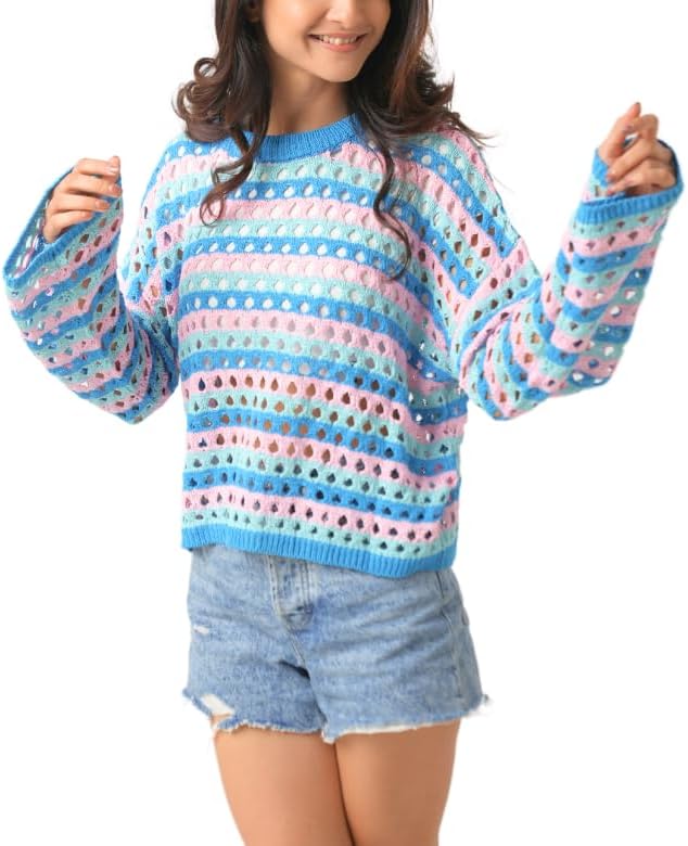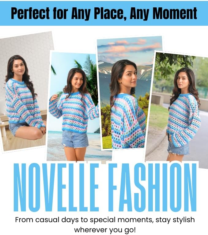 I never thought I’d fall so hard for an open knit sweater for women, but the Novelle hollow-out crochet top completely changed my mind. From the moment I unpacked it, I could tell it was special. The blend of sky blue, pastel pink, and light turquoise stripes added the perfect splash of color without being overwhelming.