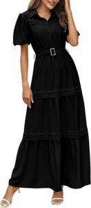 Dresses cinched at the waist with a belt are known for highlighting proportions and adding a stylish touch to any outfit. A long black belted dress, for instance, is an elegant and timeless addition to any wardrobe, with its sleek black color adding a classic touch and the belted waist creating a flattering silhouette.