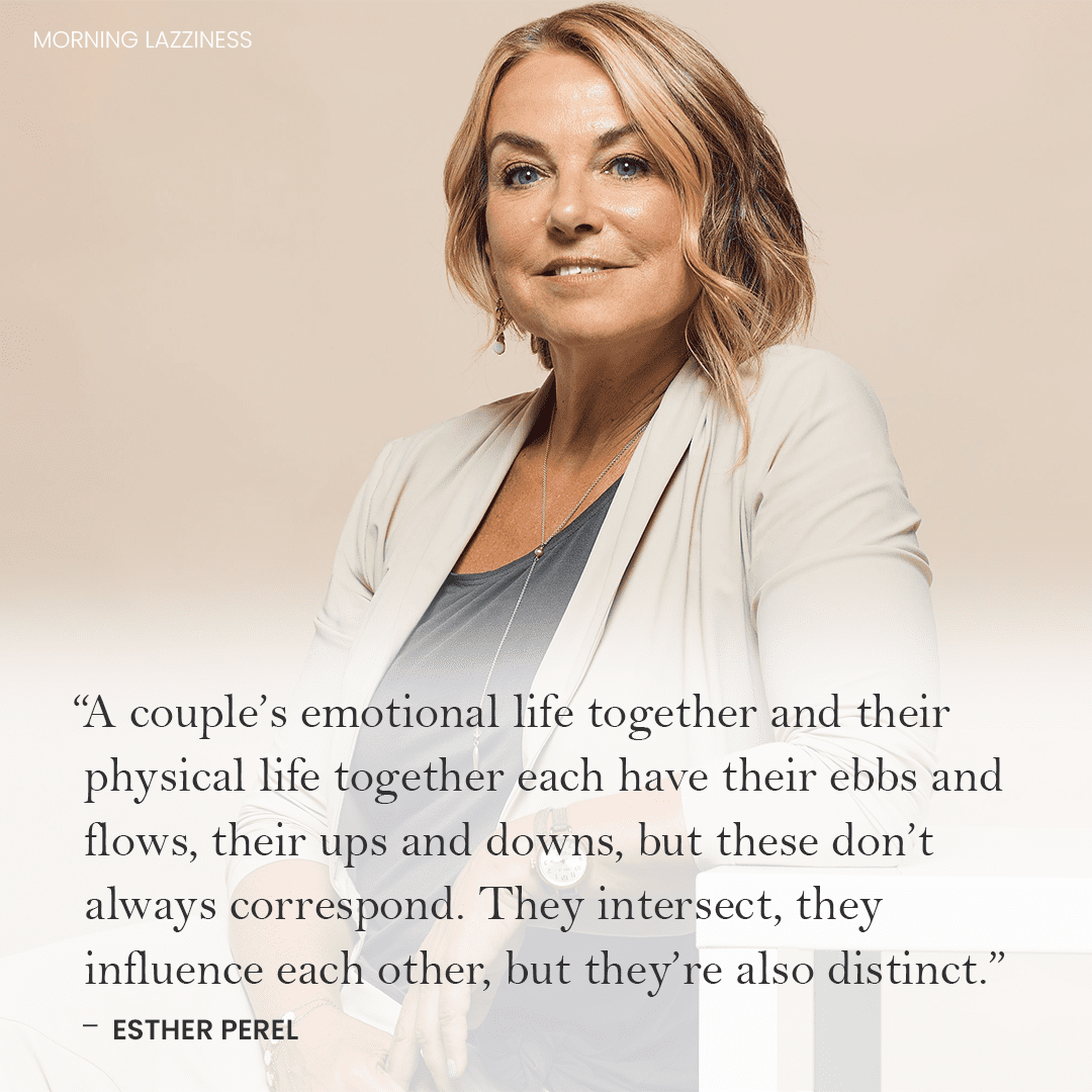 “A couple’s emotional life together and their physical life together each have their ebbs and flows, their ups and downs, but these don’t always correspond. They intersect, they influence each other, but they’re also distinct.” – Esther Perel