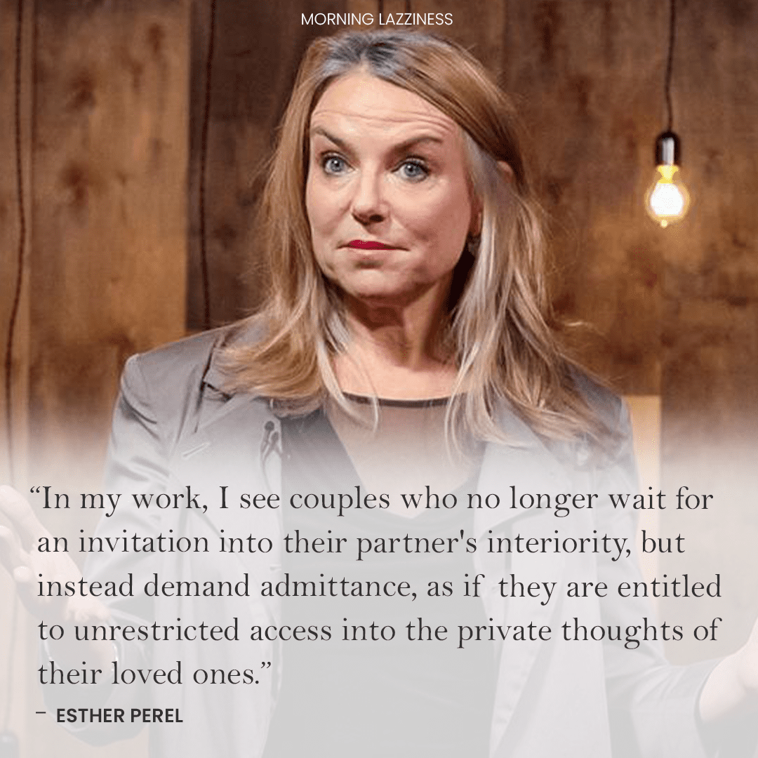 “In my work, I see couples who no longer wait for an invitation into their partner’s interiority, but instead demand admittance, as if they are entitled to unrestricted access into the private thoughts of their loved ones.” – Esther Perel