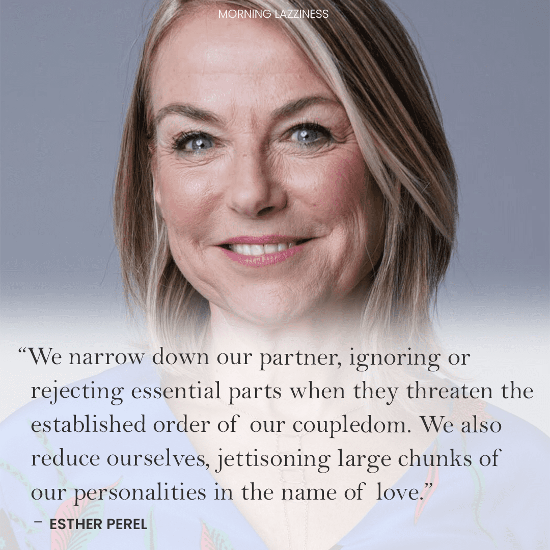 “We narrow down our partner, ignoring or rejecting essential parts when they threaten the established order of our coupledom. We also reduce ourselves, jettisoning large chunks of our personalities in the name of love.” – Esther Perel