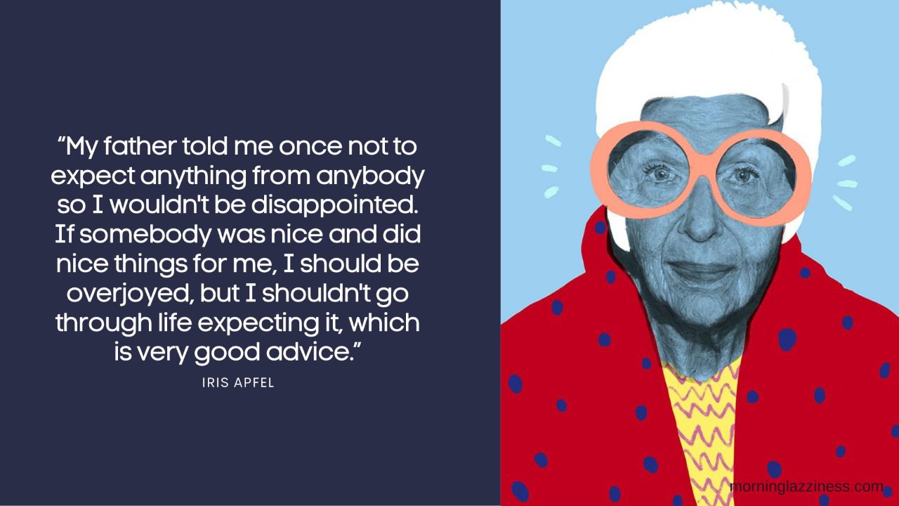 “My father told me once not to expect anything from anybody so I wouldn’t be disappointed. If somebody was nice and did nice things for me, I should be overjoyed, but I shouldn’t go through life expecting it, which is very good advice.” – Iris Apfel