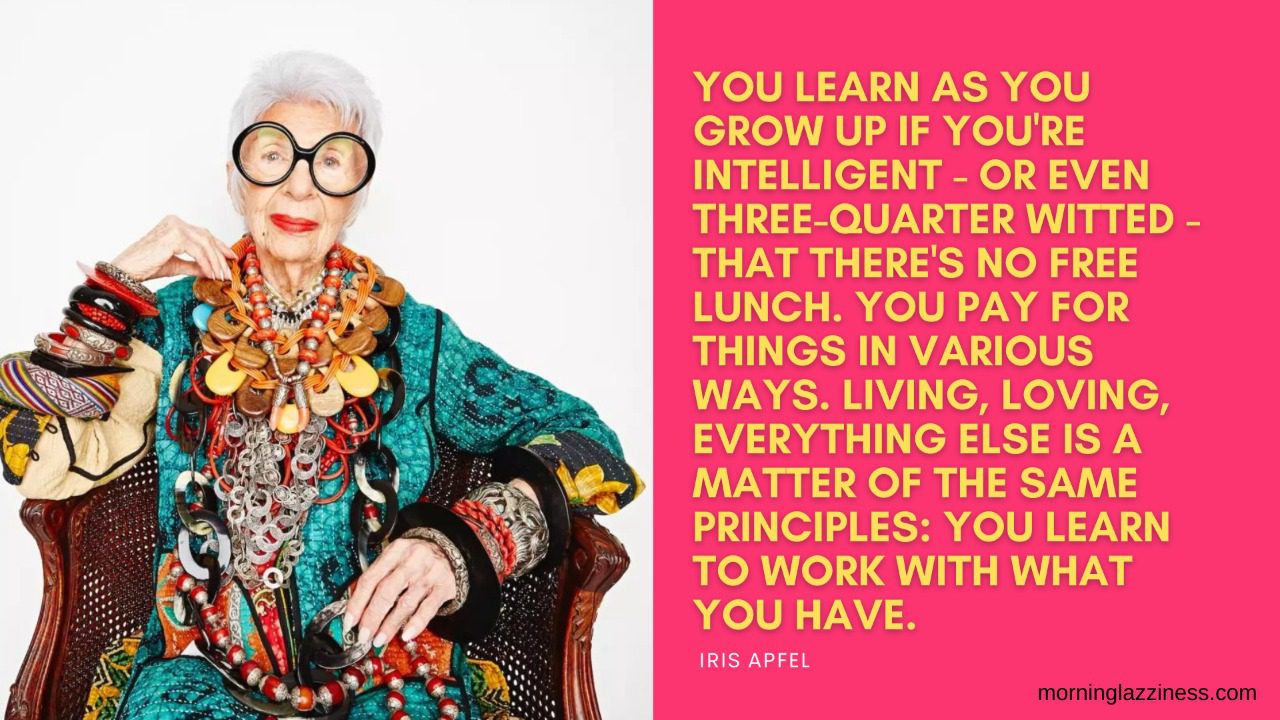 “You learn as you grow up if you’re intelligent – or even three-quarter witted – that there’s no free lunch. You pay for things in various ways. Living, loving, everything else is a matter of the same principles: you learn to work with what you have.” – Iris Apfel