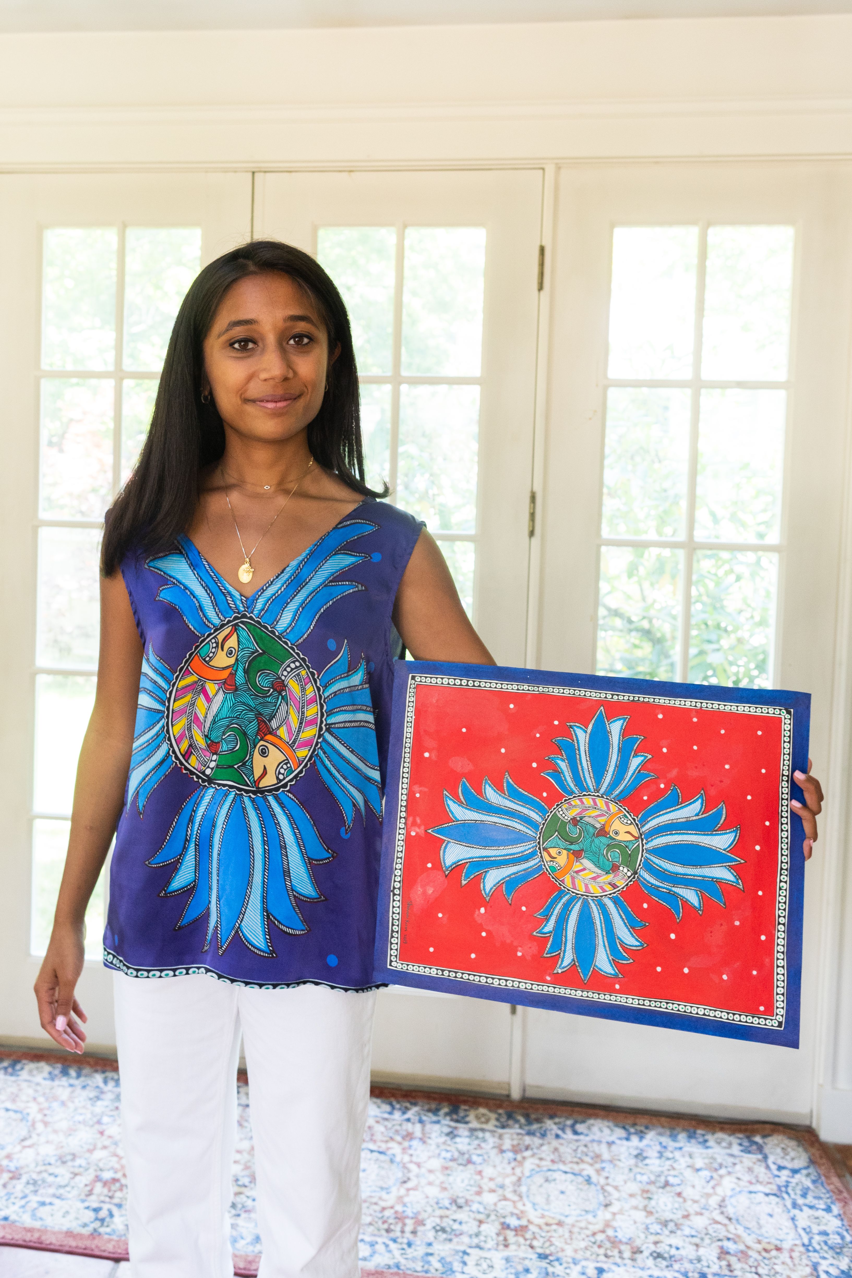 Naytra Couture is a brand that creates a unique experience that combines art and fashion to bring an exclusive collection of one-of-a-kind wearable art with 100% pure mulberry silk tunics, tops, and scarves. The starting point for our exclusive collection begins with the artwork created by folk artisans dedicated to keeping the ancient folk art of Madhubani (meaning a “forest of honey”) alive.