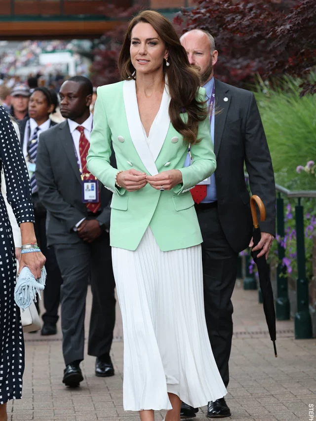 Kate donned a mint green double-breasted blazer with a pleated white skirt and white pumps.
