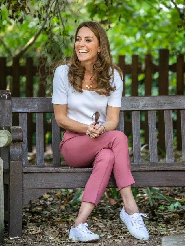Kate styled her white crochet shirt with brown pants and go-to sneakers.