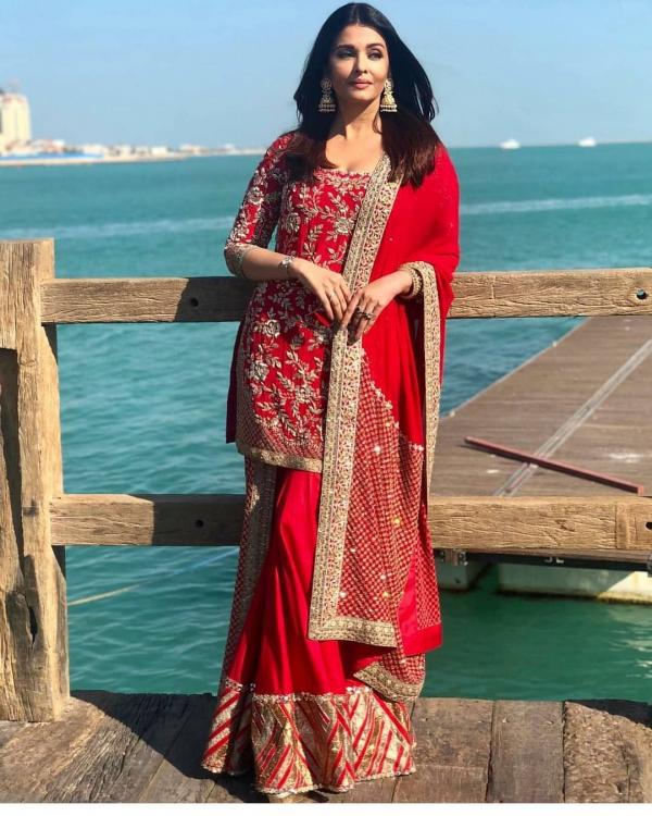 On an occasion, Aishwarya wore this sensational red suit with heavy embroidery, straight hair, and of course, her signature red lip.