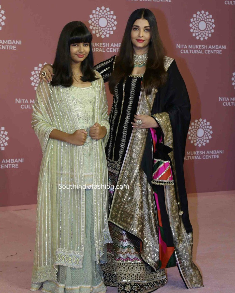 Aishwarya donned a black sharara set adorned with gota-patti work at the hem, complementing the look with a statement neckpiece.