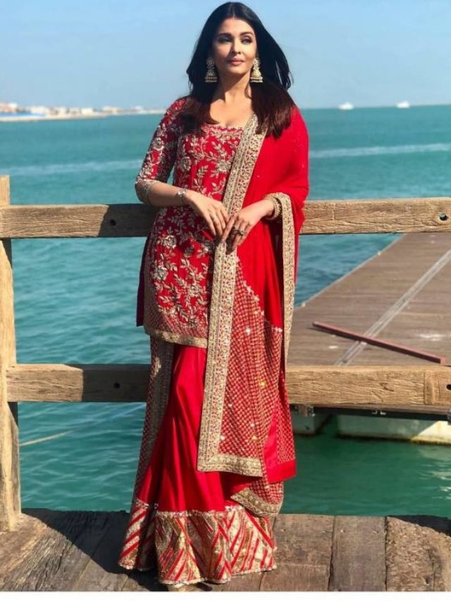 Aishwarya looks effortlessly beautiful in this red sharara, pick the same attire for your Roka ceremony, and you will look elegant.