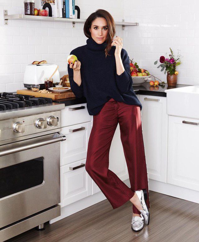 Meghan beauty captivated us in maroon trousers paired with a black turtleneck and silver loafers.