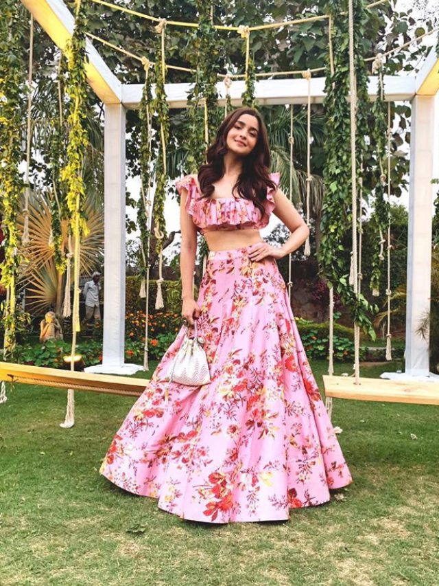 Alia looks adorable in this pink floral lehenga, making it a great fit for the Haldi function.