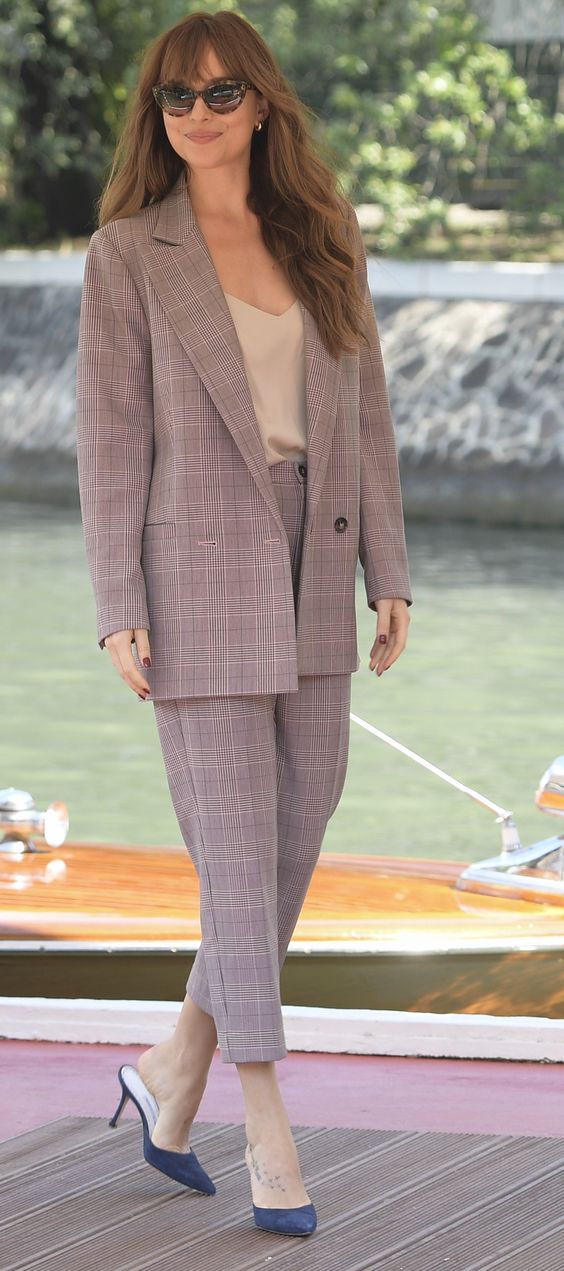 Dakota donned a plaid blazer, a black t-shirt, blue jeans, and a classy tote bag.