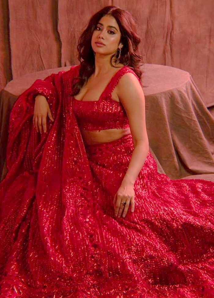 Janhvi looks gorgeous in the ruby red lehenga; with the flattering square neckline and wide straps, she made a fashion-statement.