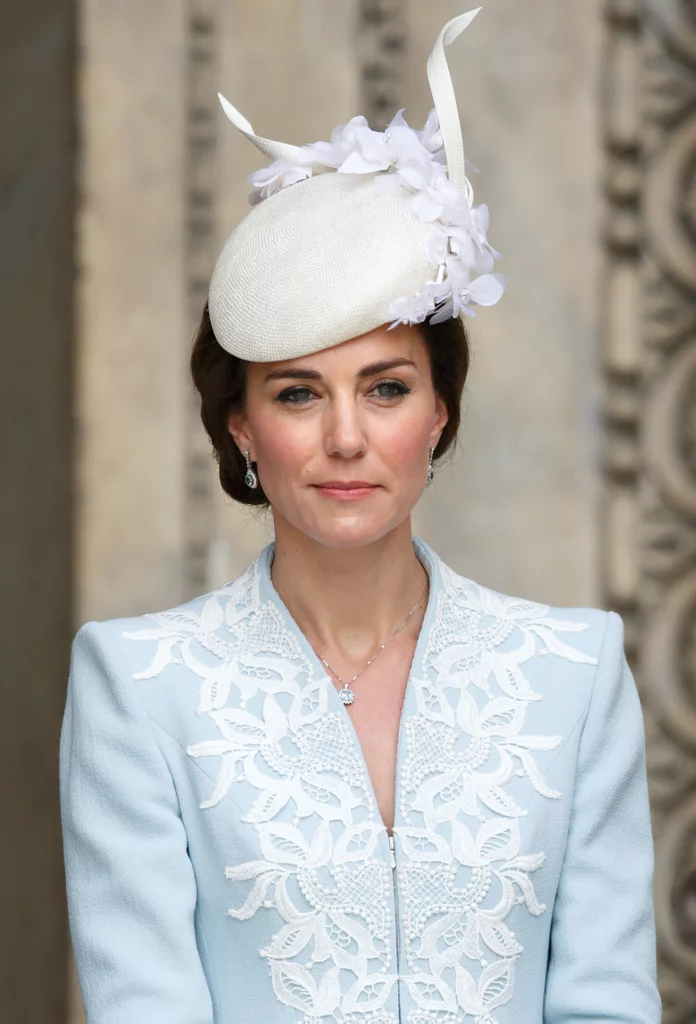 Kate wore a beautiful white blazer dress with a matching hat that has flowers.