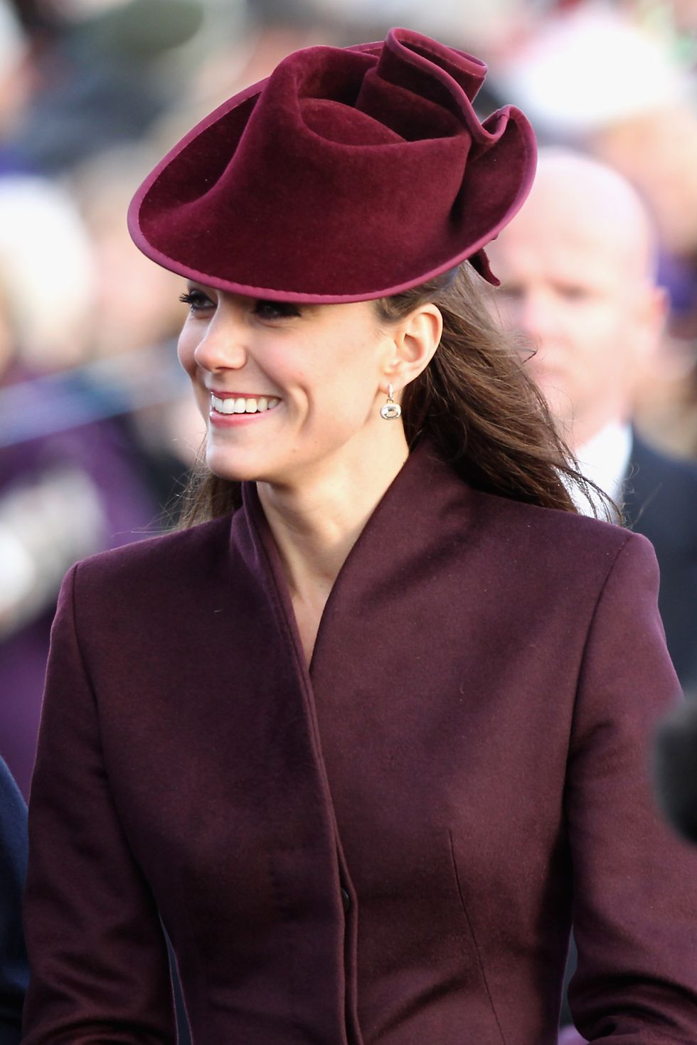 For her first Christmas as an official royal family member, Kate chose a burgundy hat.