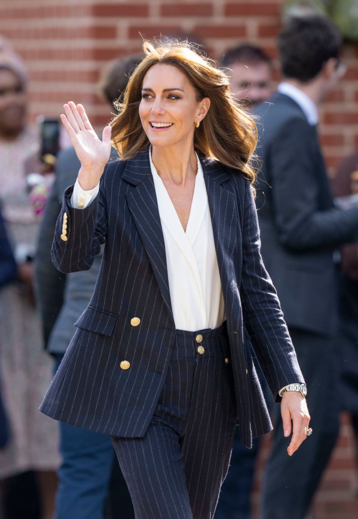 Kate looked charming in a royal blue blazer paired with a statement pearl necklace.