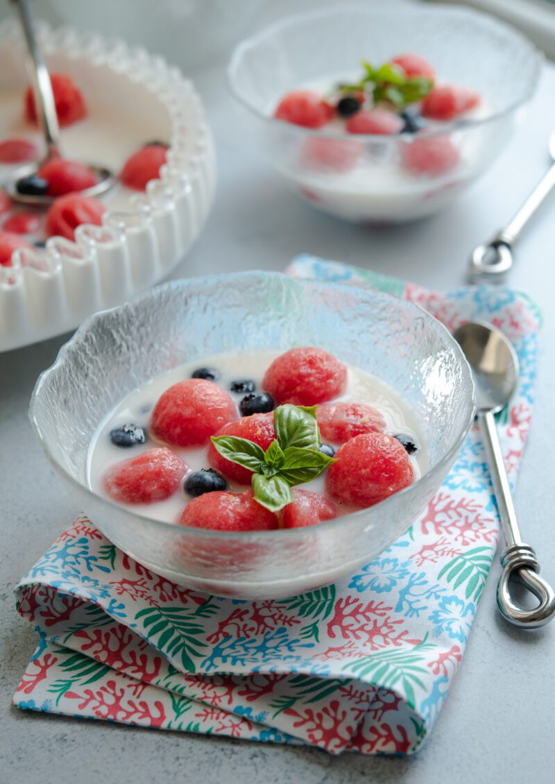 Refreshing fruit salad made with a variety of fruits, sweetened with a light syrup or fruit juice, and often served with ice cubes.