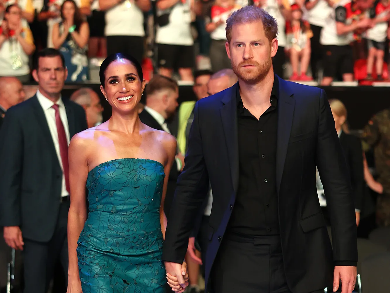 Hands in-hands with Prince Harry, Meghan looks classy in a golden dress paired with statement heels.