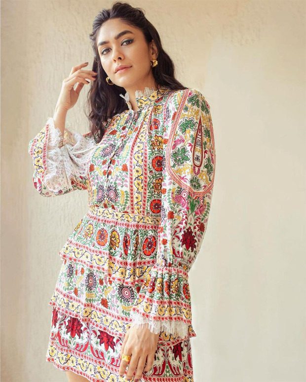 Mrunal looks superb in a vibrant floral dress; keeping the makeup subtle and tied up hair, she looks adorable.