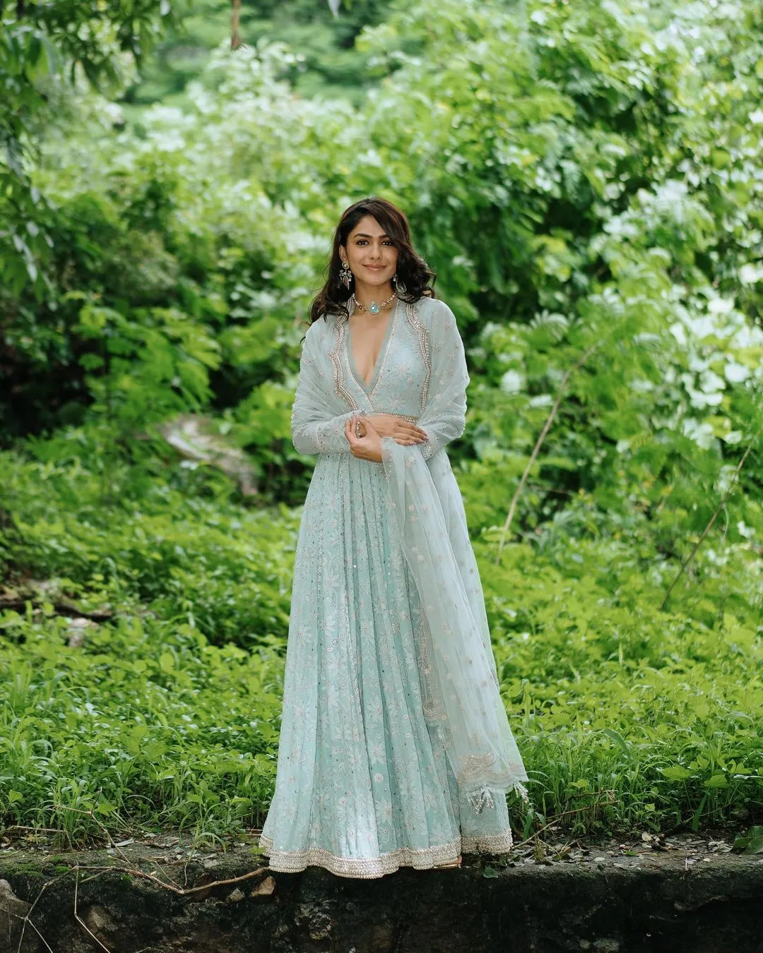 Mrunal looks breathtaking in this powder blue Anarkali suit; its deep V-neck grabs all the attention.