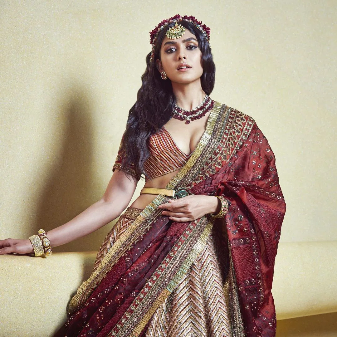 Mrunal embodied regal elegance in a richly embroidered maroon and gold lehenga.