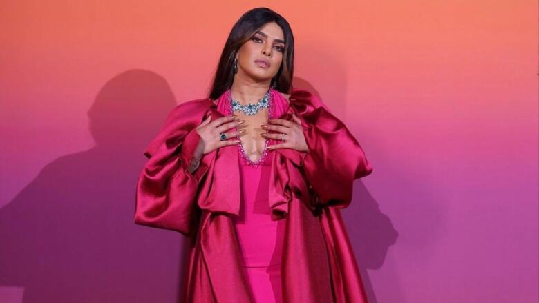 Priyanka looked effortlessly chic in a pink off-shoulder gown, accessorised with beach waves and a diamond choker.