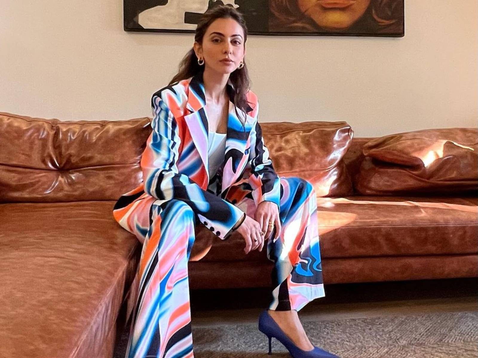 Rakul shines in a vibrant pantsuit paired with gold hoops and blue heels.