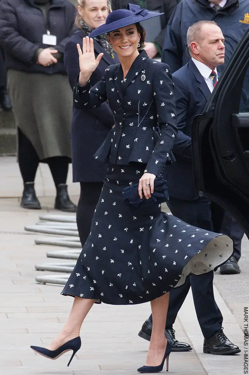 Kate exuded grace and charisma in this refined blue polka dot skirt set adorned with a matching hat.