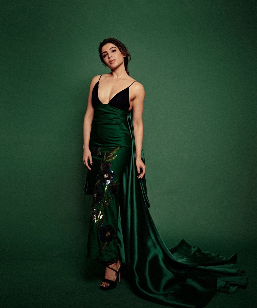 Samantha looks regal in a beautiful green suit, she had completed the look with a statement pair of earrings.