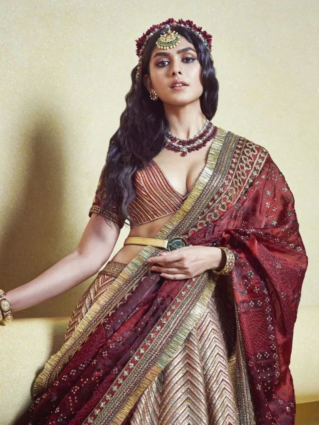 The beauty of grace, Mrunal looks captivating in an embroidered red lehenga.
