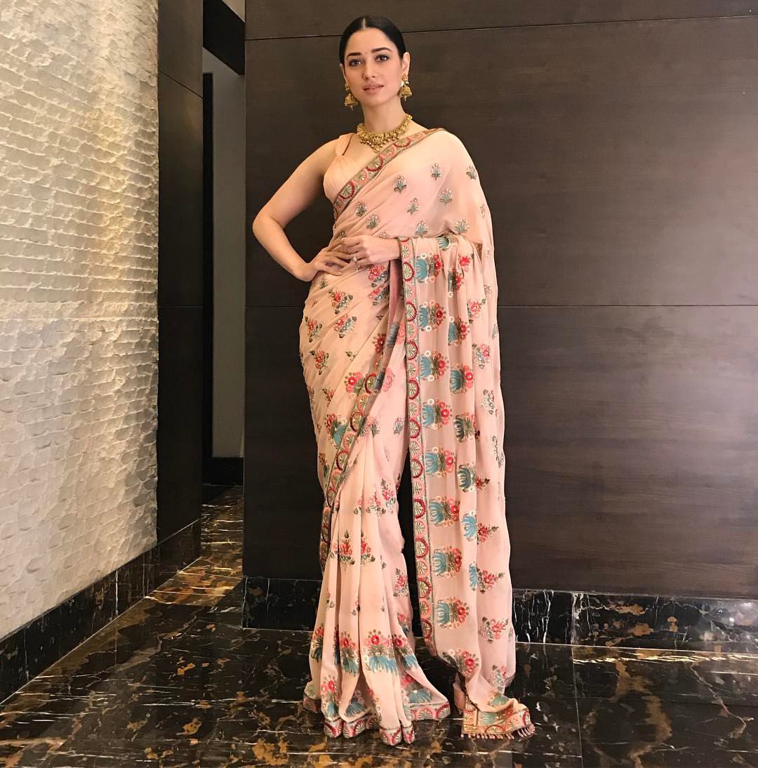 A high bun, paired with beautiful gold jewelry, Tamanna the beauty of grace looks magnificent in this pink embroidered saree.
